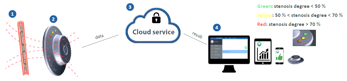 VesselSens entwickelt ein intelligentes therapeutisches Überwachungsgerät, StentGuard für die schnelle, zuverlässige, kostengünstige und frühzeitige Diagnose von Restenose auf nichtinvasivem Wege. Das Gerät besteht aus einem Stent mit integrierten Sensoren (1), einer Ausleseeinheit (2) und einem webbasierten Server (3), der die Daten verarbeitet und eine Ampelanzeige (4) zur Unterstützung der Diagnose (anhand der NASCET-Kriterien) bereitstellt. StentGuard bestimmt den Grad der Restenose auf der Grundlage der Pulswellendruckdifferenz im Stent und ermöglicht eine häufige und kostengünstige